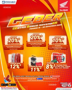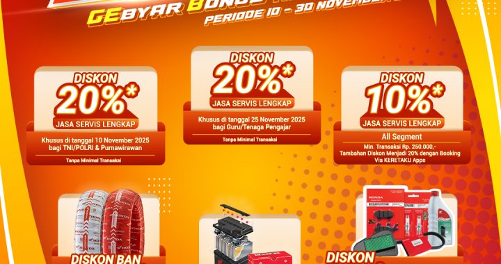 Memang hanya Honda dan AHASSnya yang selalu memberikan sesuatu yang lebih jika memiliki motor Honda. Di bulan November 2025 ini tepatnya dimulai dari tanggal 10-30 November, AHASS se SUMUT kembali menggelar pesta Diskon Jasa Servis dan Part asli Honda yaitu HGP. Promo ini bernama GEBER (Gebyar Bonus November) yang juga sekalian memperingati Hari Pahlawan yang jatuh pada tanggal 10 November 2025 ini, dimana khusus untuk anggota TNI/Polri beserta Purnawirawan juga ada Diskon Spesial. Selain itu di November ini juga pada tanggal 25 November 2025 untuk Guru atau Tenaga Pengajar ada juga Diskon Spesial. Jadi bulan November ini benar-benar bulan untuk para Pahlawan. Honda bersama AHASSnya juga ikut mau memberikan sumbangsih bagi kelancaran perawatan motor Honda dengan harga terjangkau yang artinya Honda dan AHASS mau menjadi Pahlawan juga bagi para pemakainya.